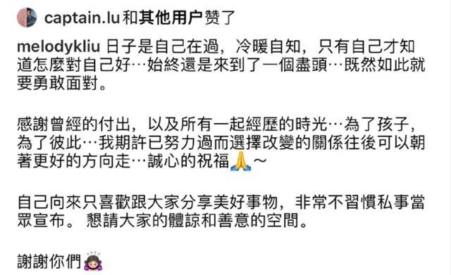 Melody还表示日子是自己在过,冷暖自知,只有自己才知道怎么对自己好,她希望未来能够朝着更好的方向走,还希望大家给她一些体谅的空间。