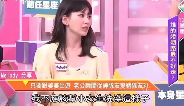 Melody曾在节目中公开吐槽老公吴育奇很爱玩,在她生第一胎的时候,老公从国外回到家,第一件事并不是照顾老婆,而是说了一句“你们都还好吧”就直接去按摩了,这让Melody气愤不已,甚至还得了产后抑郁症。Melody在怀二胎已经8个月的时候,挺着大肚子在雨中带老大看病,老公吴育奇也没有陪伴在身边。