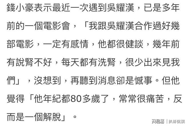 对于吴耀汉突然离世的消息,钱小豪有悲有“喜”,称他知道吴耀汉深受肾病的折磨,如今已经80多岁了,离开反倒是一种解脱。