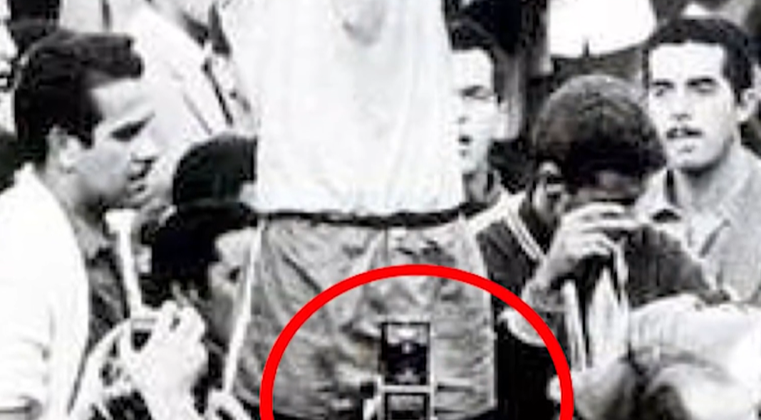 还有这张照片,它是在1962年国际足联世界杯决赛中,巴西战胜捷克斯洛伐克后拍摄的,那个拿着奖杯的人就是巴西选手加林查,但这都不是重要的,大家注意看,在照片的正下方,有一个人似乎在用手机给加林查拍照,而要知道在哪个年代,根本就不可能出现这么小巧的设备,而这些让很多网友认为,这是时空穿越的证据。