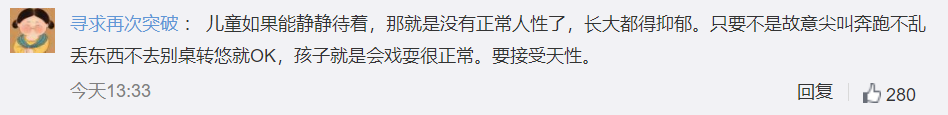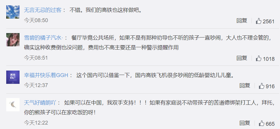 新加坡餐厅这一举动登上了中国国内新浪微博的热搜榜,引发了许多中国网友的热议。平时深受“熊孩子”尖叫摧残的网友们举双手赞成,表示如此“人性化”的措施应该速速“引进”中国。并且不仅是餐厅,更应该扩大适用到高铁、飞机这样的需长世界逗留且密闭的场所。