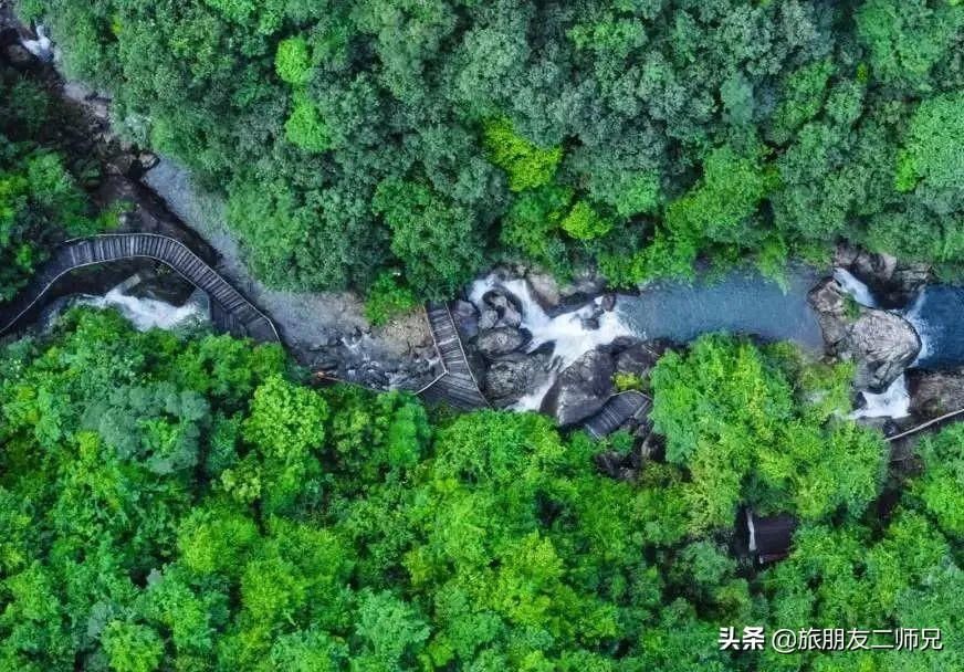亲水栈道贴着溪流,指向山谷深处,沿着木栈道一路上山,这也是天梯的一部分。