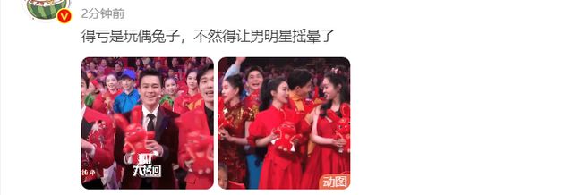 开场大合唱一人发了一只玩偶兔子,但是男女明星的摇兔子手法是完全不一样。女星这边都轻轻摇着兔子可爱又美丽,男星这边好像蹦迪气氛组,网友调侃还好是玩偶兔子,要不就晃晕了。