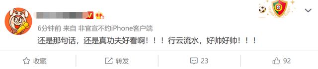 赵文卓的武术表演一出场就获赞无数,观众纷纷表示中国功夫太赞了,赵文卓腾空回马枪更是一绝,动作行云流水,不愧是专业选手。