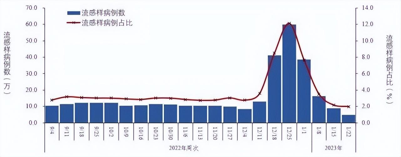 结果显示:2022年9月-12月上旬,哨点医院每周流感样病例(体温≥38℃,伴咳嗽或咽痛之一)数量稳定在10万左右,至第51周(12月19日-25日)达到最高60万;流感样病例占门(急)诊就诊人数比值在2.7%-3.6%区间波动,第50周(12月12日-18日)明显上升至8.5%,第51周达到最高12.1%,第52周起快速下降,2023年第3周(1月16日-月22日)已下降至2.0%,回落至本轮疫情之前水平(图2-4)。